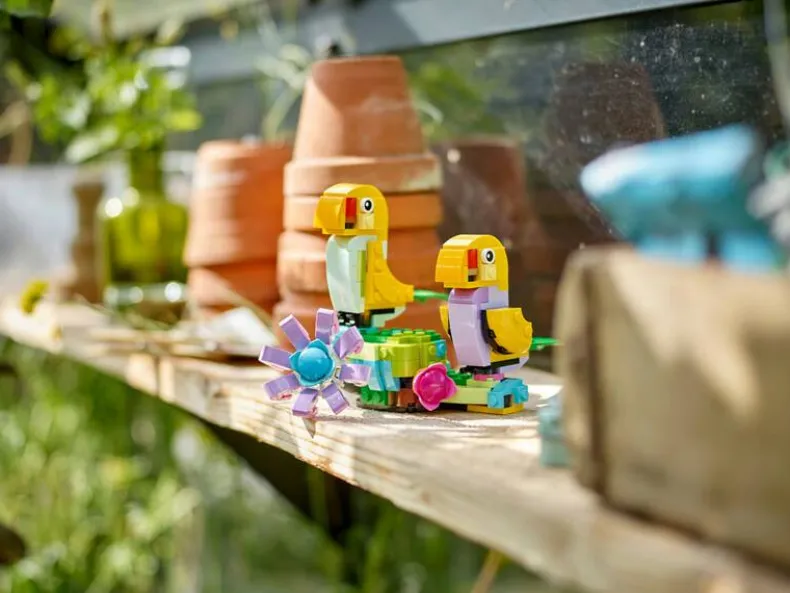 - 3-in-1 set: bouw een gieter met bloemen en vlinders, een regenlaars met bloemen, of twee vogeltjes op een zitstok