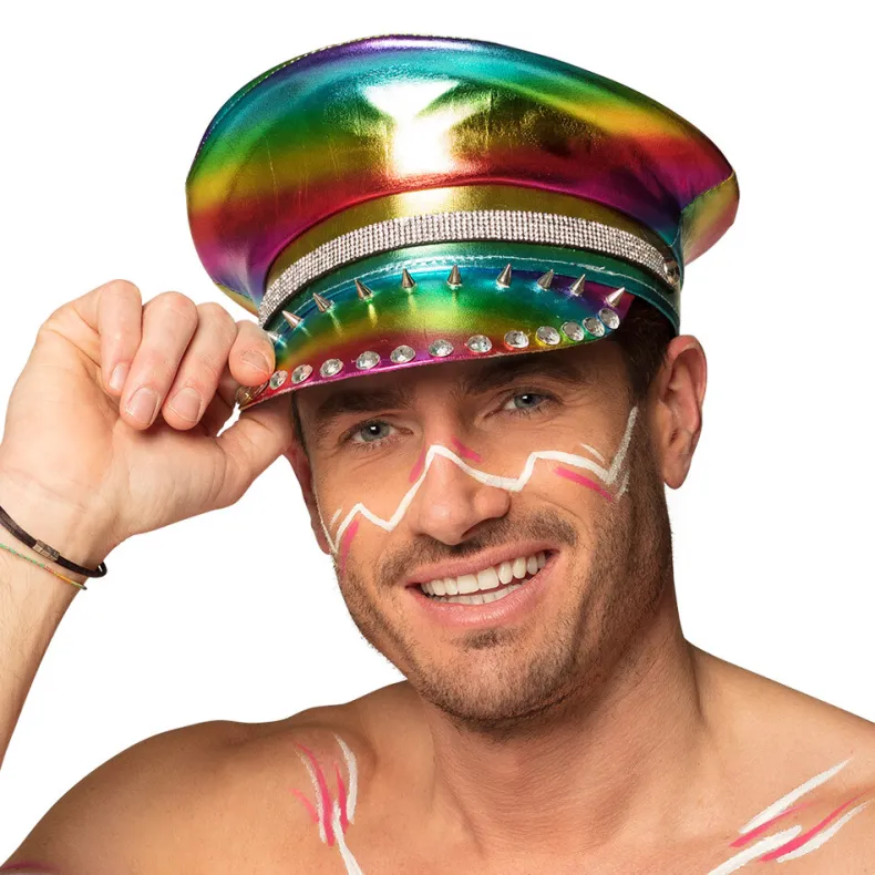 Stoere rainbow rock pet met metallic regenboog kleuren en studs. De perfecte hoed om een kleurrijke Pride en festival look een stoere touch te geven. De pet is geschikt voor zowel mannen als vrouwen.
