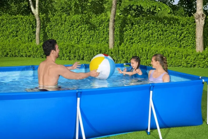 Het rechthoekige Bestway zwembad heeft een lengte van 300 cm, een breedte van 201 cm en een hoogte van 66 cm. Met de meegeleverde filterpomp inclusief filter cartridge houd je het water schoon.