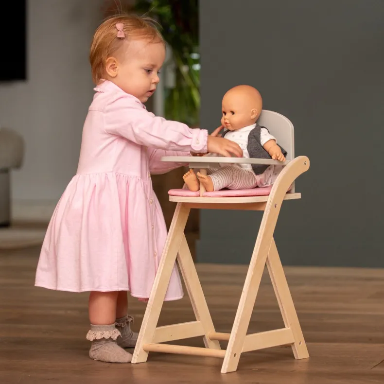 Geef jouw pop eten in deze mooie kinderstoel! Deze houten poppen kinderstoel wordt geleverd met een kussentje in de kleuren roze/ wit. De kinderstoel is geschikt voor alle poppen.