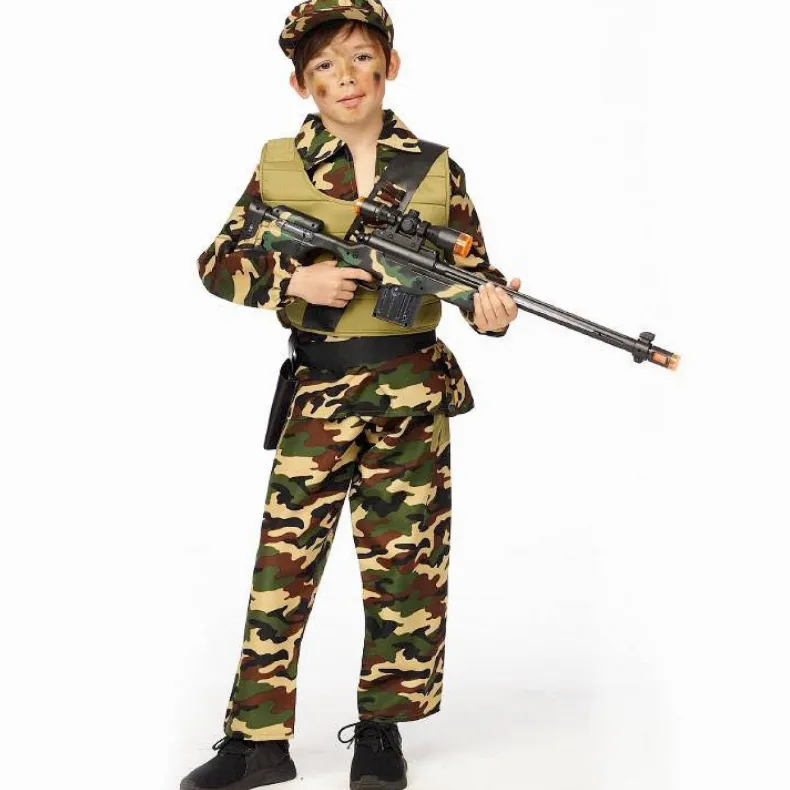 Zeer mooi en kwalitatief legerkostuum voor kinderen, maat 116. Bestaat uit broek, hemd, vest, riem met holster en pet. Exclusief geweer.
