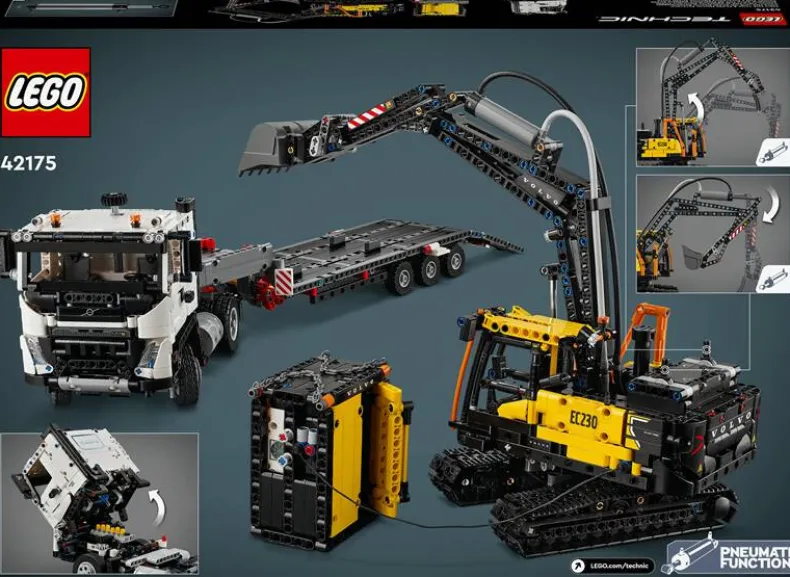 Met de LEGO Technic Volvo FMX truck & EC230 elektrische graafmachine (42175) kunnen kinderen vanaf 10 jaar hun eigen zware bouwvoertuigen bouwen en besturen! Deze set bevat een realistische Volvo vrachtwagen en een elektrische graafmachine, compleet met een oplaadstation. Door de deuren te openen en de cabine te kantelen, ontdekken jonge bouwers de 6-cilindermotor met bewegende zuigers. Klaar om aan het werk te gaan? Breng de truck in positie, koppel de oplegger los en laat de graafmachine van de oprijplaat afrollen voor het ultieme bouwavontuur!
