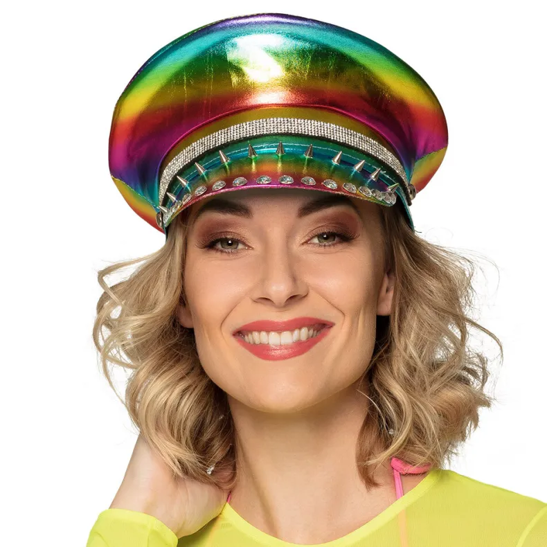 Stoere rainbow rock pet met metallic regenboog kleuren en studs. De perfecte hoed om een kleurrijke Pride en festival look een stoere touch te geven. De pet is geschikt voor zowel mannen als vrouwen.