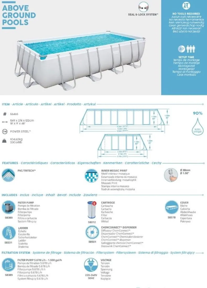 Inbegrepen: filterpomp 3 m³/u -filtercartridge II – ladder 122 cm – chloorverdeler – afdekzeil.