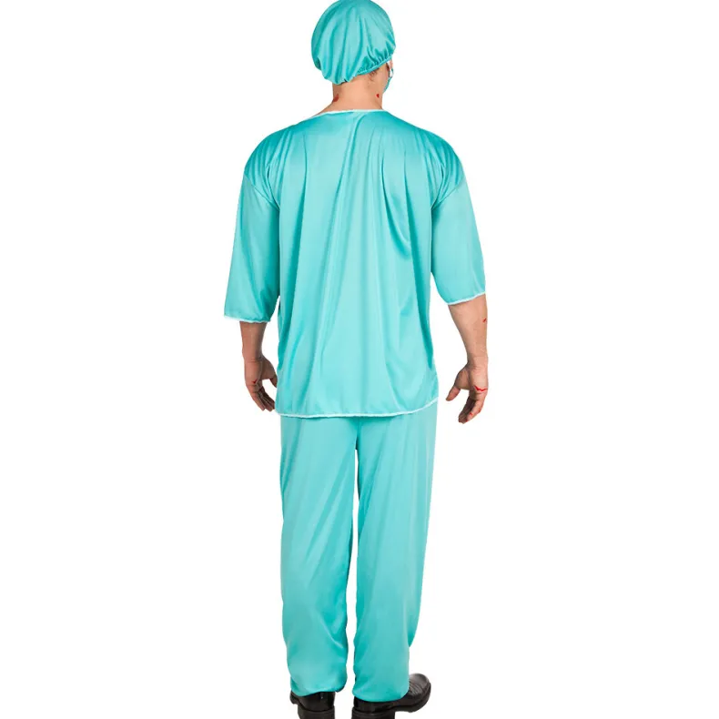Het Bloederige Chirurg volwassenenkostuum in maat M/L bestaat uit een met bloed bespat shirt een broek, een kapje en een mondmasker.